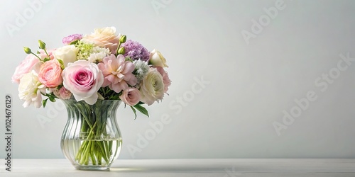 Still life with crystal vase and pastel flowers on white background