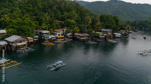 Stilt Houses and Colorful Boats line the Shore in a Serene Tropical Bay Landscape View
