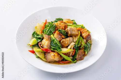 Stir fried kale with crispy pork in oyster sauce on white plate