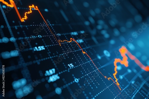 Stock market chart, numbers and orange upward line, blue background