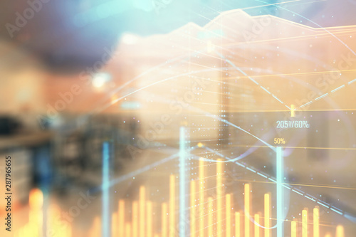 Stock market chart with trading desk bank office interior on background. Double exposure. Concept of financial analysis
