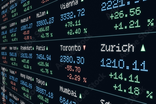 Stock market data, Paris, Vienna, Toronto, Hong Kong, Tokyo. Percentage changes, moving up and down. Device screen, business, international trading information. Concept, 3D illustration