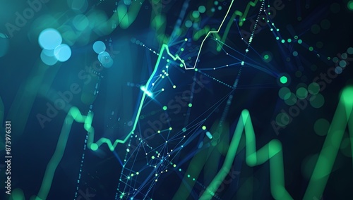 Stock market graph in blue and green colors on a dark background, showcasing financial analysis and planning with charts and graphs, set against an abstract digital backdrop to emphasize its role in b