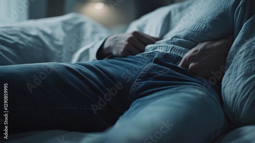Stomach pain relief with a person resting on a soft bed. Featuring discomfort and comfort