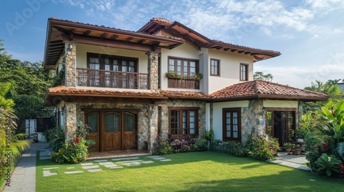 house, home, stone, wood, green, lawn, garden, architecture, modern, exterior, plant, tropical, landscaping, window, door, roof, balcony, brown, white, two-story, luxury, residential, front, yard, grass, patio, pathway, nature, beautiful, bright, sunny, sky, tree, view, outdoors, daytime