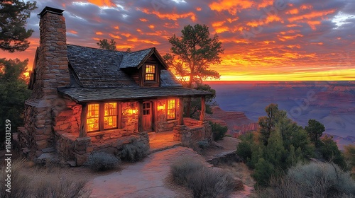 cabin, stone, sunset, grand, canyon, vista, house, home, filed, fire, light, window, wall, tree, sky, cloud, orange, red, purple, dusk, evening, rock, mountain, desert, arizona, nature, landscape, scenic, beautiful, picturesque, peaceful, tranquil, serene, remote, secluded, wilderness, wild, rustic, cosy, warm, comfort, view, majestic, breathtaking