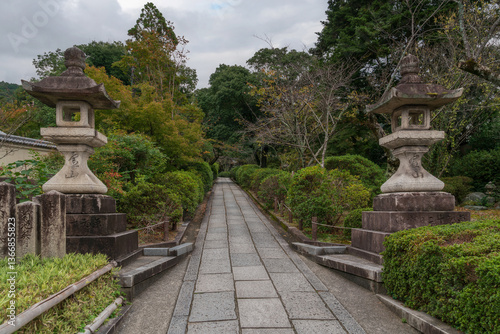 Stone Lanterns (ishi-dore) on the territory of the Kiyomizu-dera Buddhist Temple on the mount Otowa on an autumn day, Kyoto, Japan