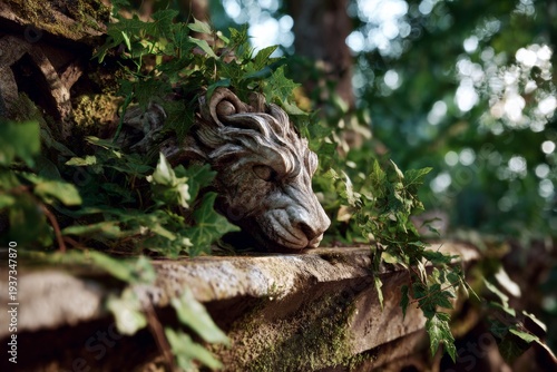 Stone Lion Head Surrounded by Green Vines in a Forest Setting During Daytime With Soft Sunlight Filtering Through Trees