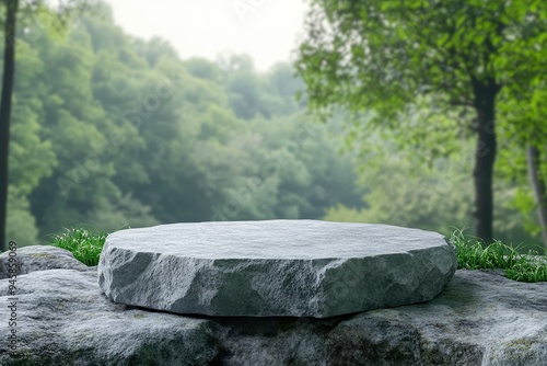 Stone podium on rock platform 3d illustration, grey rock pedestal for a product display stand, green forest and blurred on the background, natural scenery landscape , ai