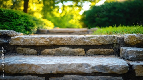 Stone steps in a green garden. A close-up photo of a stone stairway with a blurred background of green foliage, perfect for projects related to nature, landscaping, and outdoor design.