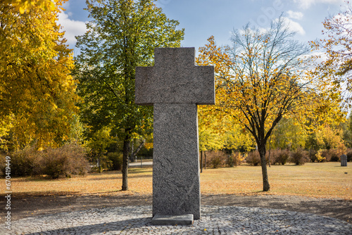 Stone tombstones in the German cemetery in the fall. Beautiful German cemetery near Kyiv. Many dead German soldiers of the dead during the 2nd World War.