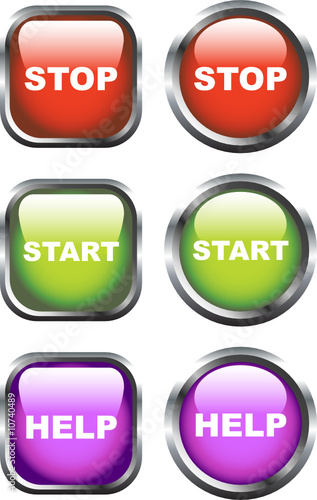 buttons, start, help, symbol, web, choice, stop, ball, glasses, glossy, icon, illustration, red, green, purple, set, shiny, signs, vector, metallic