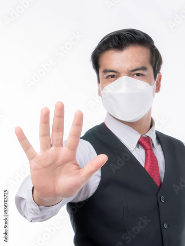 Stop Civid-19 , Asian man wearing Face Mask protect spread Covid-19 Coronavirus on white background