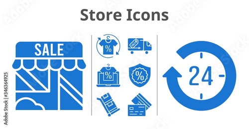store icons set. included online shop, 24-hours, shop, shirt, warranty, delivery truck, credit card, trolley icons. filled styles.