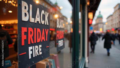 Store window decorated with "Black Friday - fire" posters, busy shopping street in background
