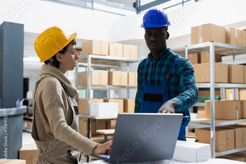 Storehouse diverse employees managing stock and inventory for distribution, shelving units and organized storage of parcels. Employees manage delivery systems for order accuracy and flow.