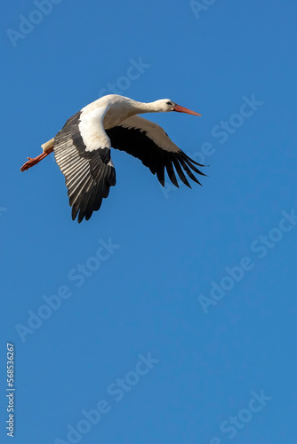 Stork flying over a meadow in Büttelbron in Hesse, Germany at a cloudy day in winter.