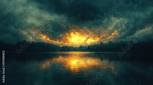 Storm clouds moving in over a calm lake with a glowing digital reflection, approaching weather.