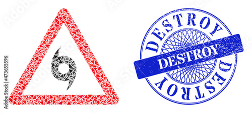 Storm whirlpool warning collage of triangle items, and Destroy dirty seal imitation. Blue stamp seal has Destroy caption inside round shape.