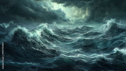 stormy, sea, ocean, wave, dark, sky, cloud, water, nature, dramatic, rough, turbulent, blue, green, grey, white, foam, crest, horizon, weather, natural, power, force, wild, intense, powerful, unpredictable, element, chaos, energy, motion, depth, abstract, background, landscape, painting, art, digital, illustration