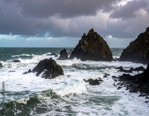 ocean, storm, wave, rock, coast, dark, grey, cloud, sky, water, foamy, powerful, dramatic, wild, rocky, shore, coastal, rough, oceanic, turbulent, nature, landscape, grayish, stormy, windy, violent, seascape, exterior, rugged, huge, foreboding