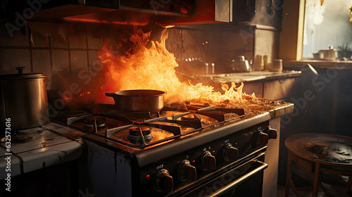 Stove ignited in the kitchen during cooking, smoke and soot around, fire at home