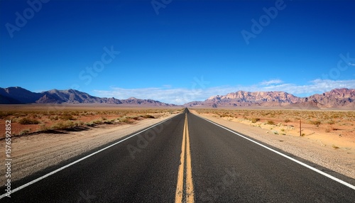 straight desert highway with mountains and blue sky background