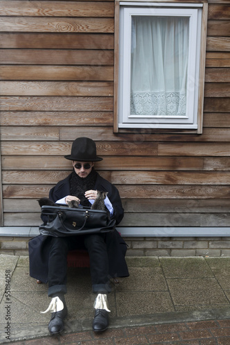 strange man wears black coat hat hold suitcase
