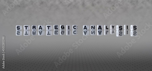 strategic analysis word or concept represented by black and white letter cubes on a grey horizon background stretching to infinity