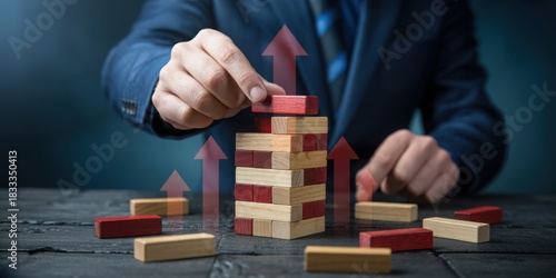 strategy, growth, business, success, management, planning, investment, finance, achievement, development, opportunity, progress, leadership, teamwork, risk, challenge, solution, innovation, vision, corporate, competition, market, economy, wealth, return, profit, goal, future, direction, target, performance, diagram, stack, wooden, block, arrow, upward