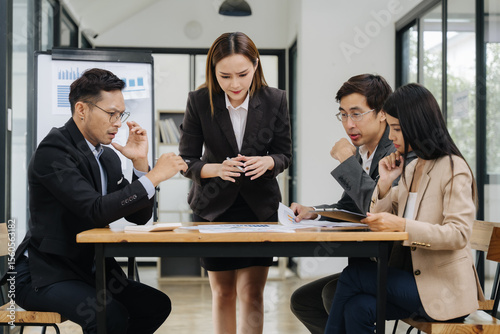 Strategic Minds at Work: A Focused Team Engaged in Dynamic Discussions and Analysis. Capturing the essence of collaboration and innovative thinking, in a bright and modern office environment.