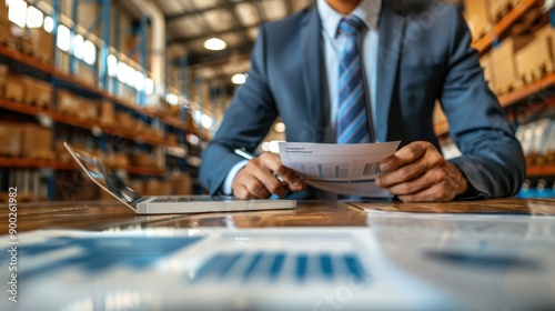 Strategic Procurement Consultant Analyzing Purchasing Data with Whimsical Manipulation against Warehouse Backdrop