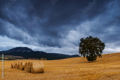 Straw bales in the field at sunset with dramatic sky