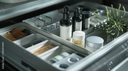 Streamlined cosmetic storage box filled with various high-end skincare products