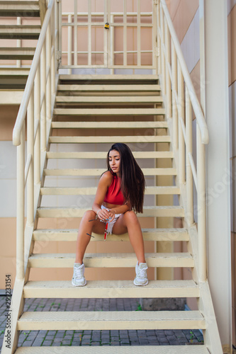 beautiful, casual attire, fashion, female, woman, young, attractive, beauty, girl, model, people, portrait, stair, street, summer, teenage, teenage, urban, caucasian, jean, 1, person, shoe, sneaker, happy, lifestyle, style, background, body, brunette, cheerful, european, face, friendly, full body, full-length, posing, short, sport, modern, long hair, fit, pose, city, dancer, ladder, staircase, staircase, footway