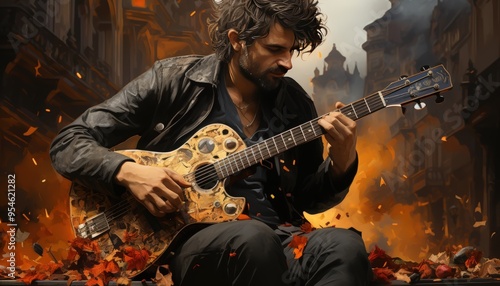 Street Performer Playing Guitar in a Busy City Square Captivating Passersby with Melodic Tunes and Lively Atmosphere
