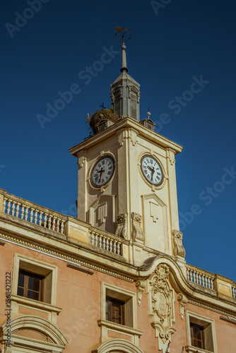 Street photography in Alcala de Henares, Madrid, Spain. Mayor street (calle Mayor) and main square.