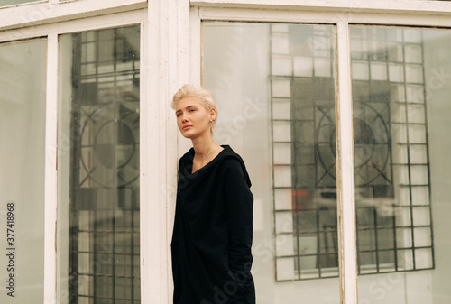 pretty, blond, street, half face, shadow, real, portrait, people, outdoors, 1, natural, model, light, lesbian, glamour, fashion, facial expression, face, eye, cute, coat, clothing, building, blond, black, beauty, beautiful, architecture, apparel, short hair, woman, accessory, window, wear, sun, style, caucasian, white, girl, female, person, adult, adult, 20s, young adult, young adult, young person, grown-up