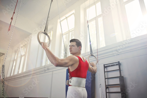 gym, exercise, man, athlete, ring, rope, acrobat, indoor, sport, active, hard, strong, force, athletic, fit, body, fitness, somersault, jump, overall, work, arm, training, photogenic, portrait, light, window