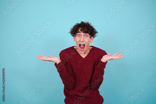 Stress and joy. Funny guy posing in the studio on a blue background.