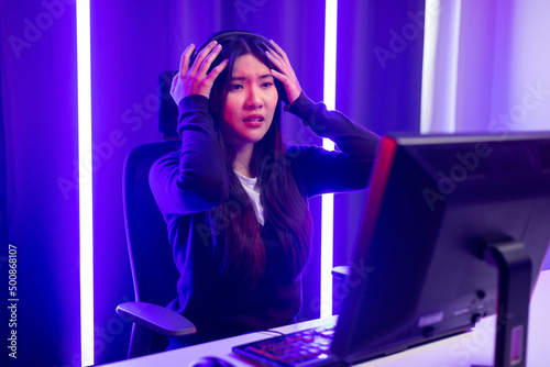Stressed Boring and loses. Young pretty asian woman playing game computer pc. Female Gamer on headphone playing video game feeling sadness. Loss and Missed the chance to become a champion
