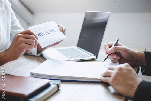 Stressed businessman receive fired letter from employer will be signing approve contract agreement, changing and resigning from work concept