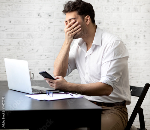 Stressed man working on laptop at home. Distance work concept