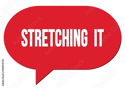 STRETCHING IT text written in a red speech bubble