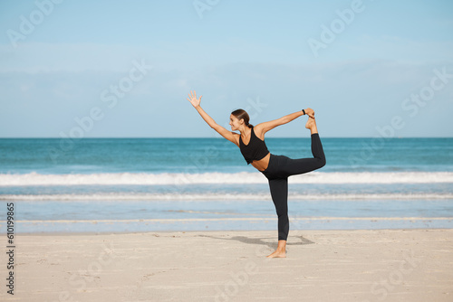 Stretching, woman and yoga on the beach for exercise, fitness or wellness workout for healthy, holistic or zen mindset. Girl, stretch and meditation at ocean, sea or outdoor pilates training