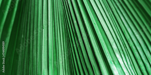 Striped green palm leaf, textured leaves summer tropical plant as natural banner background. monochrome aesthetic botanical biophilic texture, nature foliage scenery, selective focus, close up