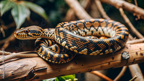 python, snake, wildlife, forest, nature, green, leaf, branch, midday, light, reptile, animal, coiled, pattern, orange, black, yellow, environment, habitat, tropical, exotic, slender, body, scale