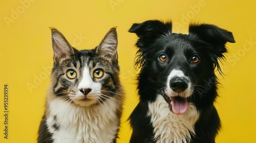 animal, pet, cat, dog, border collie, together, friendship, companion, buddy, pals, cute, adorable, fluffy, furry, playful, happy, joyful, cheerful, smiling, yellow background, bright, colourful, vibrant, fun, whimsical, humorous, charming, delightful, heartwarming, lovable, endearing