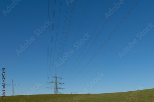 electricity, force, energy, duct, heaven, cable, electric, tower, pylon, field, stress, wire, industry, blue, high, electronic, pole, countryside, steel, nature, powerline, green, supply, metallic, technology