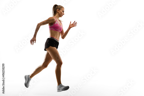 Strong. Caucasian professional female athlete, runner training isolated on white studio background. Muscular, sportive woman. Concept of action, motion, youth, healthy lifestyle. Copyspace for ad.